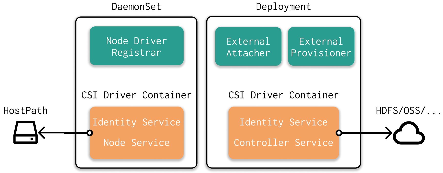 在K8s中,有两种挂载外部存储的方式,In-Tree和Out-of-Tree。In-tree 存储插件是直接集成在K8s代码库中的存储插件,由Kubernetes开发团队维护。而Out-of-tree存储插件不是K8s代码库的一部分。它们通常由存储供应商单独开发和维护,并通过Container Storage Interface (CSI)与K8s集成。 CSI Plugin主要可以分为两个部分:DaemonSet和Deployment。DaemonSet负责与Node相关的操作,Deployment负责与Volume相关的操作。