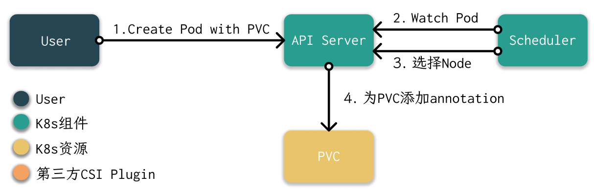 - 用户请求API Server,创建Pod、PVC等资源。