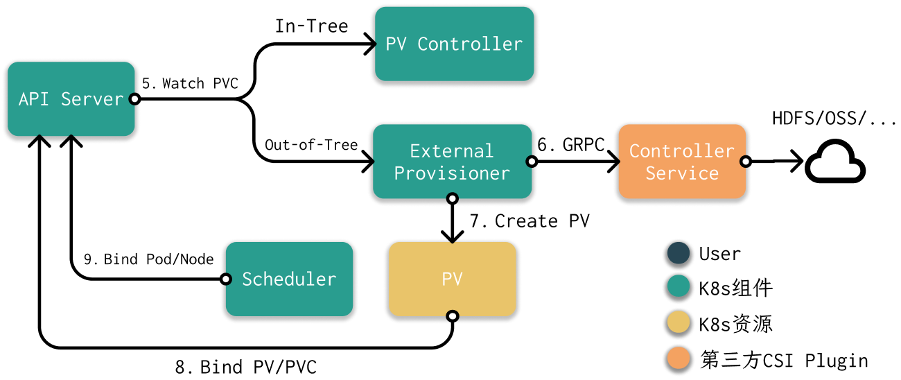 - PV Controller和External Provisioner同时都在监听PVC资源。如果PVC是In-Tree模式,那么则会由PV Controller进行处理。如果是Out-of-Tree模式,那么则会由External Provisioner进行处理。