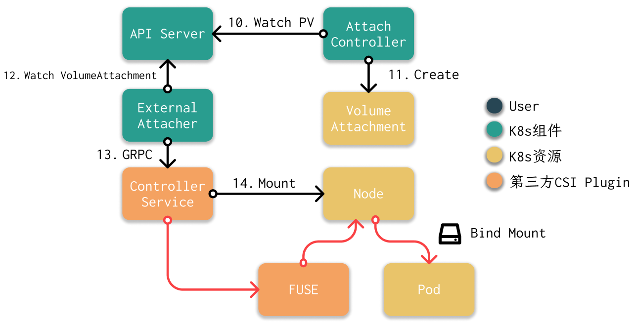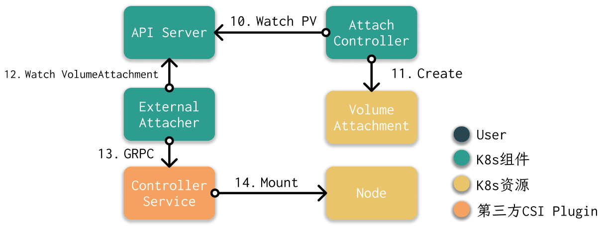 - External Attacher监听VolumeAttachment资源。