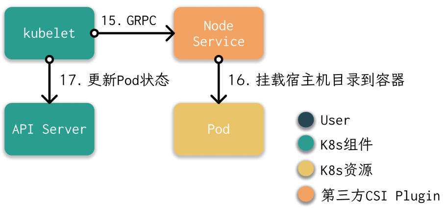 - kubelet中的VolumeManager,监听是否有新的带有PV的Pod被调度到当前Node上。然后,VolumeManager调用Node Service执行挂载。