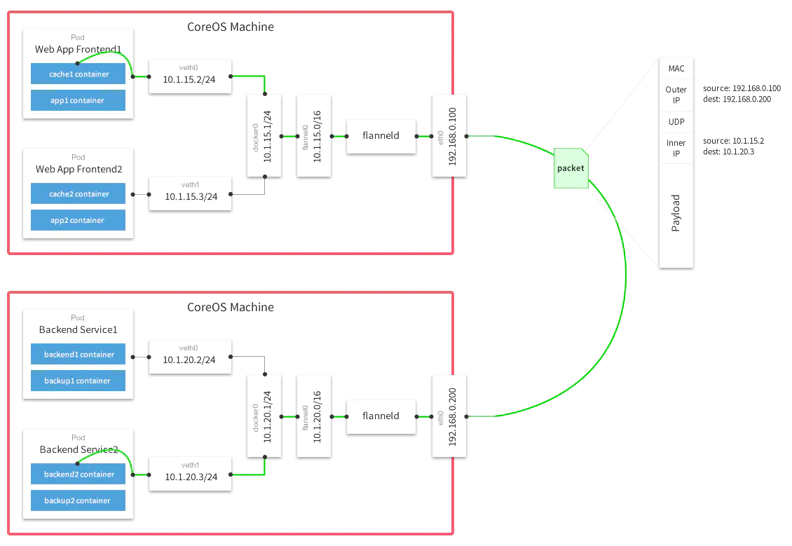 源主机的flanneld服务将原本的数据内容UDP封装后根据自己的路由表投递给目的节点的flanneld服务,数据到达以后被解包,然后直接进入目的节点的flannel0虚拟网卡,然后被转发到目的主机的docker0虚拟网卡,最后就像本机容器通信一下的有docker0路由到达目标容器。