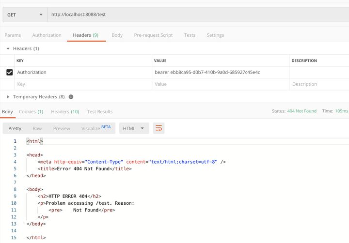 同样,我们可以看到没有任何问题。 那么,就很奇怪了🤨,服务本身没有任何问题,直接调用也可以访问,而通过网关一转发,为什么就 404 了呢?在网上查了一下午,也没有找到有人遇到过类似的问题。。。😱 问题的关键在我关闭服务后再次请求 http://localhost:8088/test 时终于找到了。正常情况下,关闭了服务后,应该没有返回的 response,但发出请求过后仍然是 404