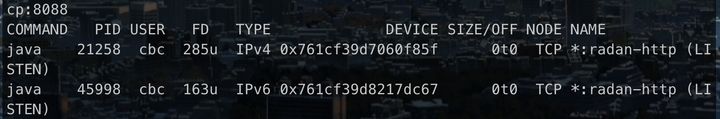 那么,就很明显了,有另一个进程也在监听 8088 端口 !!! 但还是很奇怪,那为什么服务启动的时候没有报端口被占用的错误呢??? 重新启动服务,使用 lsof -i tcp:8088 (Mac OS)查看端口占用情况